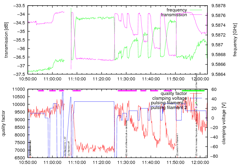 13.09.00 11:58:28 "(2) had to increas the pulse up to (60ms 1.4V) to get electrons out of the filament"